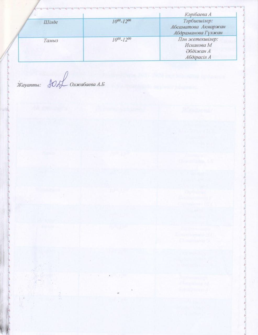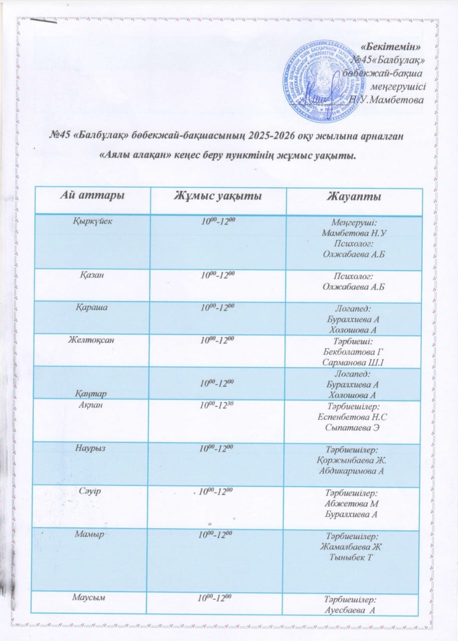 Консультатциялық пункттің жұмыс кестесі » №45 «Балбұлақ» бөбекжай-бақшасы