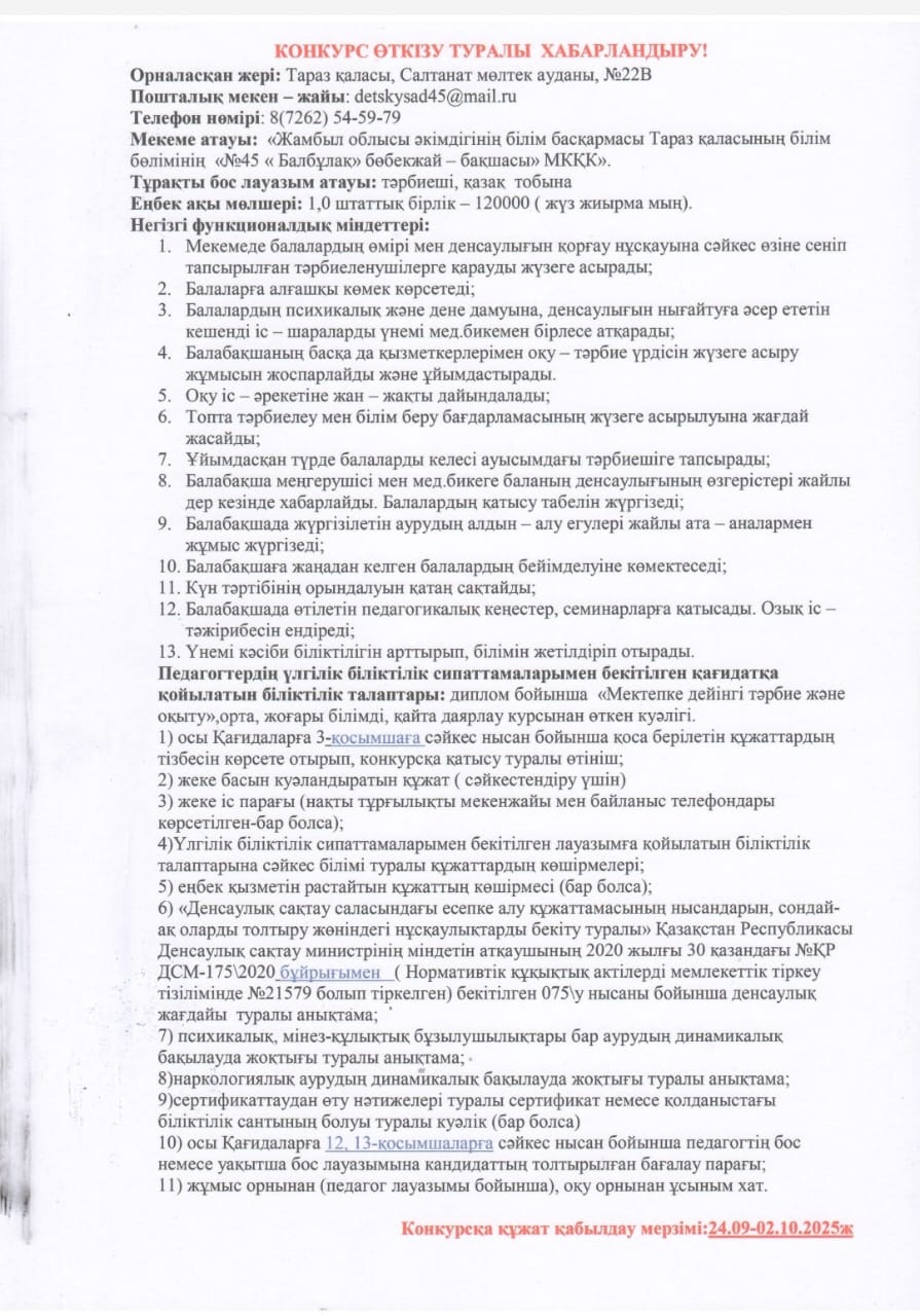 Конкурс туралы хабарландыру » №45 «Балбұлақ» бөбекжай-бақшасы