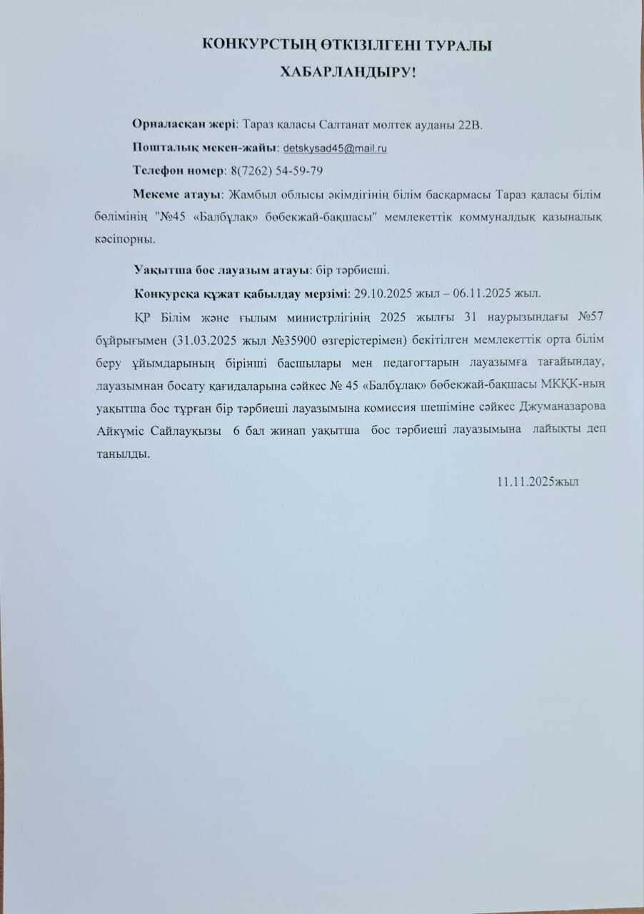 Конкурстың өткізілгені туралы хабарландыру » №45 «Балбұлақ» бөбекжай-бақшасы