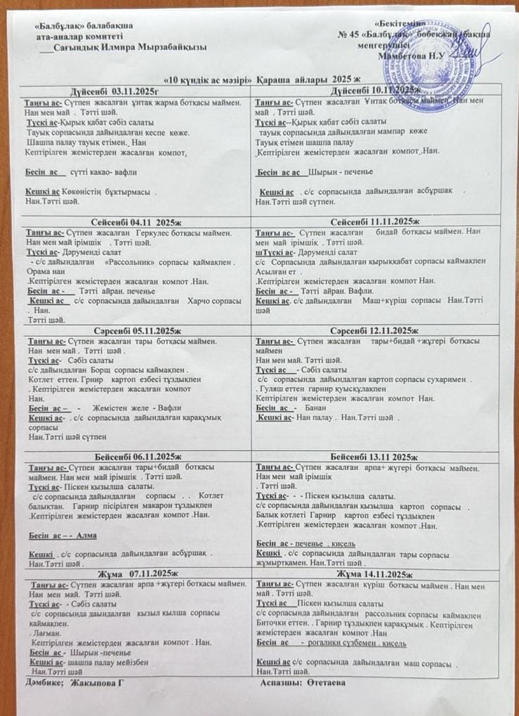 10 күндік ас мәзірі » №45 «Балбұлақ» бөбекжай-бақшасы